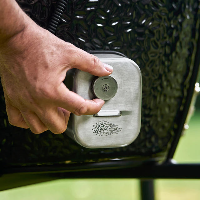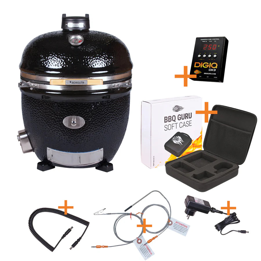 LeChef Guru Edition Grill + DigiQ DX3 Controller Set und Case gratis! Der MONOLITH LeChef Pro-Serie 2.0 BBQ Guru Edition ist das Aushängeschild für alle, die im wahrsten Sinne des Wortes großes schaffen möchten. Mit seiner stattlichen Grillfläche von 52 cm Durchmesser ist er prädestiniert für umfassende kulinarische Erlebnisse. Ob du eine Gartenparty ausrichtest, ein mehr-gängiges Menü zauberst oder als Grillprofi neue Geschmackswelten erkunden möchtest – der LeChef bietet dir die nötige Plattform. Ausgestattet mit hochwertiger Keramik, gewährleistet der LeChef eine herausragende Wärmespeicherung und -verteilung. Die Kombination aus Glasfaserdichtung mit Edelstahl-Inlay im Deckel und am Korpus sorgt für eine nahtlose Abdichtung und vereinfacht die Wartung. Das robuste Deckelventil aus Gusseisen, ausgestattet mit einem Slide-System, ermöglicht eine feine Justierung der Temperatur, selbst wenn der Deckel geöffnet wird. Die BBQ Guru Edition des LeChef Pro-Serie 2.0 zeichnet sich durch den fest integrierten BBQ-Guru Lüfter aus. Diese Innovation unterstützt eine unübertroffene Präzision in der Temperaturkontrolle, ideal für anspruchsvolle Grillmethoden und lange Garprozesse. Die geteilte Feuerbox und das integrierte Aschesammelsystem aus Edelstahl erleichtern nicht nur die Reinigung, sondern auch die gesamte Handhabung des Grills. Das einzigartige Chip-Feeder-System erlaubt es dir, Raucharomen hinzuzufügen, ohne die Temperaturstabilität zu riskieren. Das speziell entwickelte, leichtgängige Scharnier erleichtert die Nutzung des geräumigen Grills. Mit dem Smart Grid Grillrostsystem erhältst du zusätzliche Flexibilität in der Zubereitung, sodass du gleichzeitig indirekt garen und direkt grillen kannst. Der MONOLITH LeChef Pro-Serie 2.0 BBQ Guru Edition ist mehr als nur ein Grill – er ist eine komplette Grillstation, die durch ihre Größe und kulinarische Vielseitigkeit überzeugt. Er steht bereit, jede Herausforderung anzunehmen und jedes Grillereignis in ein Portfolio der Aromen zu verwandeln. Mit und ohne Gestell erhältlich. Gönn Dir den BBQ Guru DigiQ DX3 Controller, der Deinen Keramikgrill perfekt temperiert. Dieses Gerät verwaltet im Zusammenspiel mit dem bereits integrierten BBQ Guru Lüfter Deinen Grill durch automatische Temperaturregelung. Alle Einstellungen dafür nimmst du schnell und einfach direkt am Controller vor. Allerdings ist ein Hinweis wichtig: Das BBQ Guru Set ist nur für MONOLITH Keramikgrills geeignet, da Lüfter und Adapterplatte fehlen. Trotzdem bietet der MONOLITH BBQ Guru DigiQ DX3 tolle Features: - Automatische Regelung der Grilltemperatur - Kompatibilität mit allen MONOLITH BBQ Guru Edition Keramikgrills - Temperatureinstellung direkt am Gerät - Zwei Temperaturfühler für Grill- und Kerntemperatur - Ein gut lesbares LCD-Display - Simple Installation Einmal die gewünschte Grilltemperatur eingestellt, kümmert sich der dazugehörige Lüfter um die richtige Luftzufuhr. Sollte die Temperatur einmal sinken, zum Beispiel beim Öffnen des Deckels, sorgt der Lüfter für den korrekten Ausgleich. Es gibt verschiedene DigiQ Controller Sets für Deinen Keramikgrill. Wähle das passende für Deinen MONOLITH Keramikgrill mit bereits integriertem Lüfter. Für Keramikgrills von MONOLITH, Kamado Joe, Big Green Egg und The Bastard die keinen eingebauten Lüfter haben, empfiehlt sich das Universal-Set inkl. Lüfter und Adapter. Im Paket enthalten sind: - 1x BBQ Guru DigiQ DX3 Controller - 1x Kerntemperatur-Sensor - 1x Garraum-Sensor - 1x Netzteil - 1x Spiralkabel