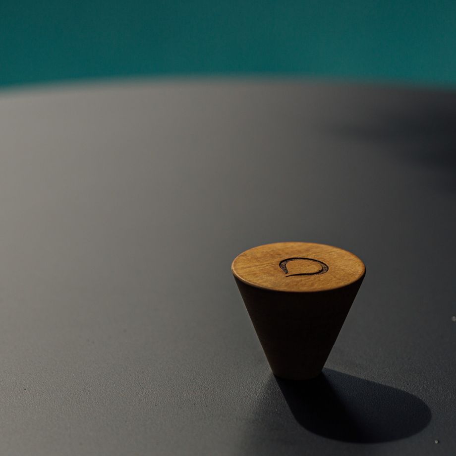 Hergestellt aus schwarzem, pulverbeschichtetem Stahl und ausgestattet mit einem Mahagoniknauf. OFYR Cover 85 und 100 passen über den Kegel und die Platte und decken Ihren OFYR ab, wenn er nicht benutzt wird.